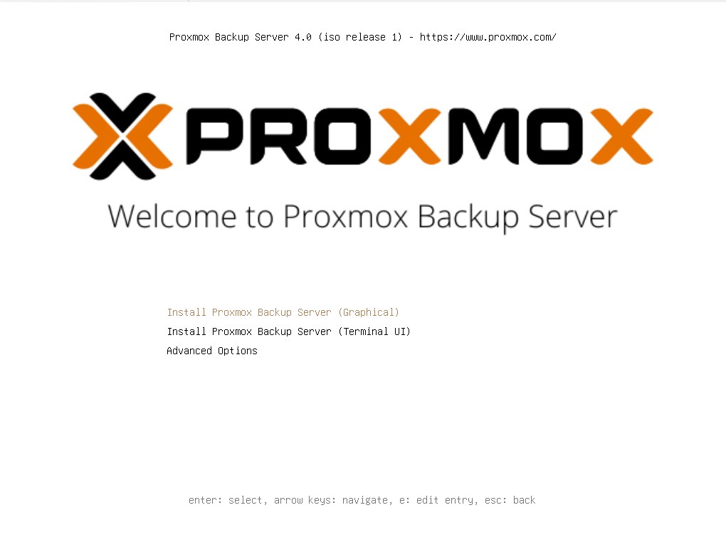 Proxmox Backup Serverのインストーラを起動すると、GUI(グラフィカル)またはCUI(テキストベース)のどちらでセットアップを行うか選択できます。