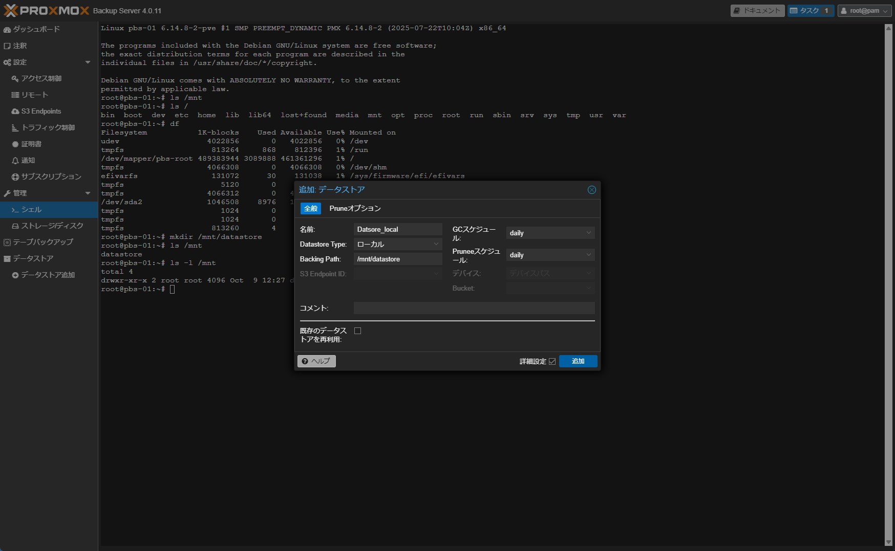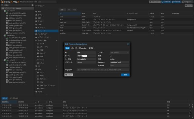 これで、Proxmox VEからProxmox Backup Serverへのバックアップ先マウントが完了します。