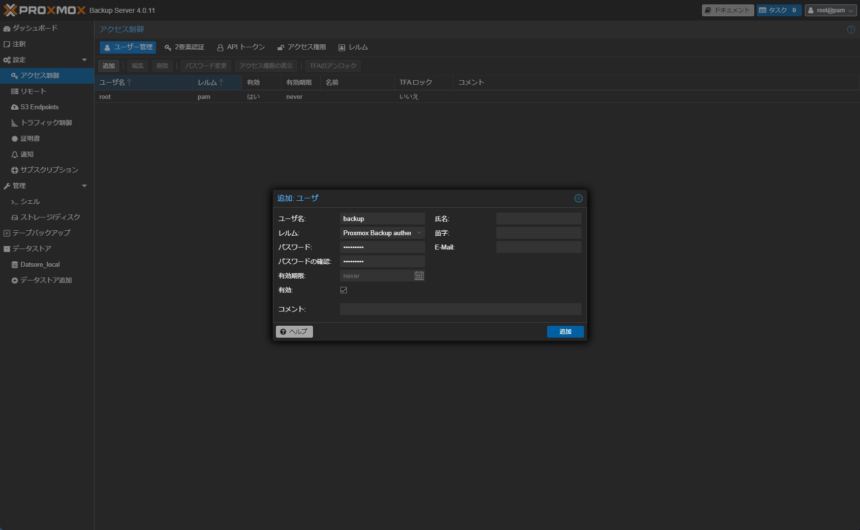 Proxmox VEからProxmox Backup Serverへ接続するため、アクセス権限を設定します。