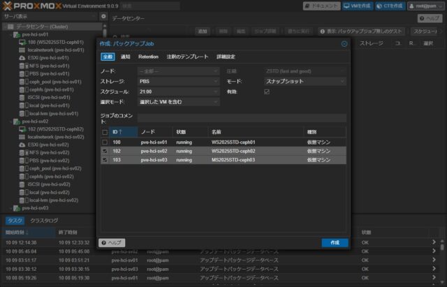 バックアップ対象(ノードや仮想マシン)、スケジュール、バックアップモード(Snapshot / Stop / Suspend)などを設定します。