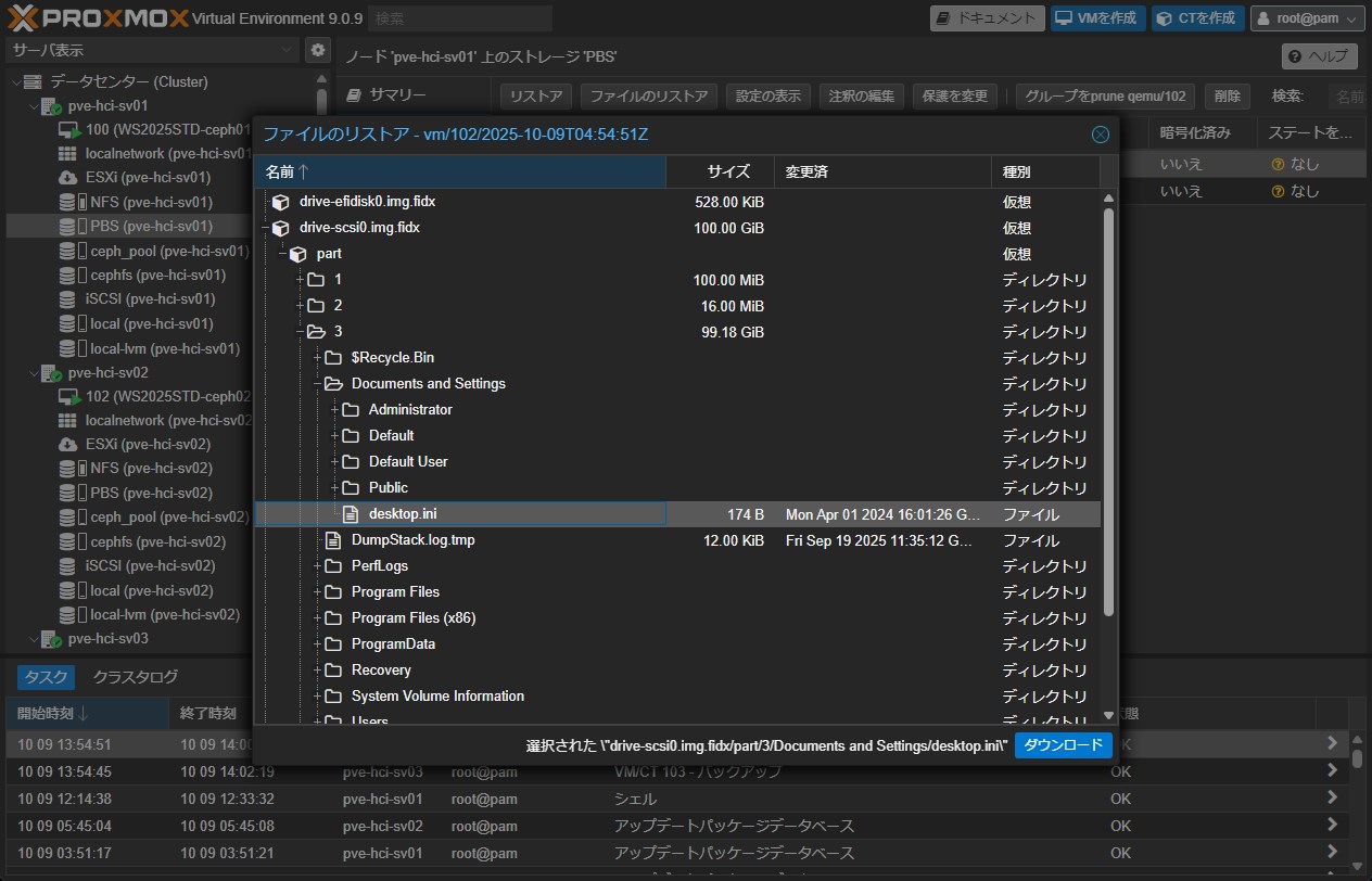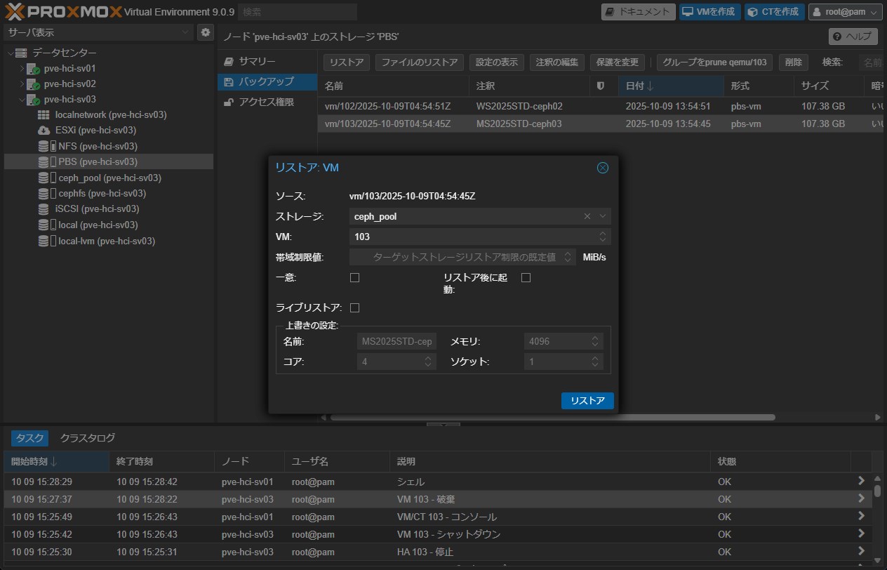 Proxmox VEの管理画面から「データセンター」→「ストレージ」→対象のProxmox Backup Serverを選択、「バックアップ」タブを開き、リストアしたい仮想マシンやコンテナのバックアップを選択します。