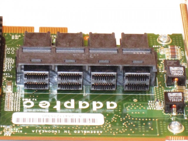 本機は今まで一般的でしたMINI-SASコネクタでは無く、MINI-SAS HD という新規格のコネクタを採用しております。それによりカードのサイズは従来と変わらずコネクタの数を増やすことが出来ます。HDDの接続台数を増やすことでRAIDパフォーマンスを大きく向上できます。もちろん容量も大きく増やせます。大容量高速ストレージを構成する場合には今後の主流になる規格でしょう。