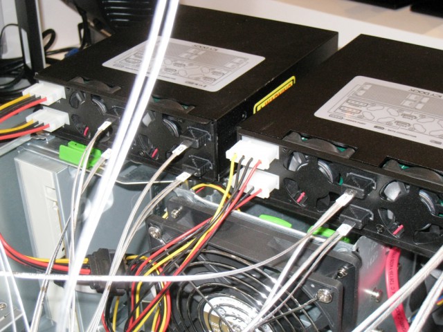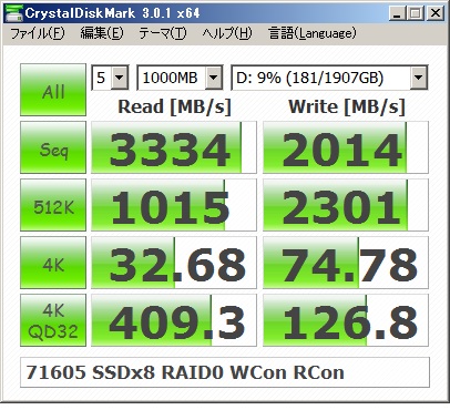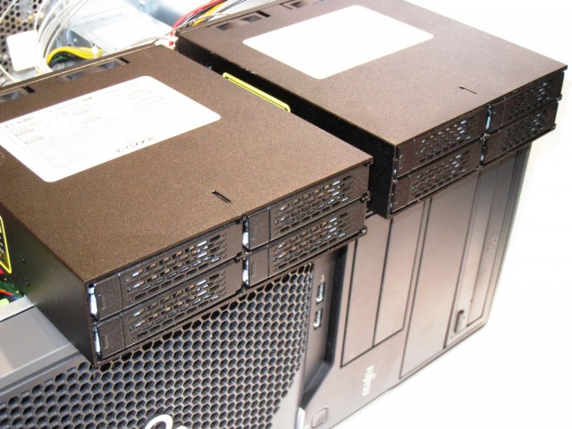 今回はRAIDカードのパフォーマンスを使ってどれだけストレージの速度を上げることが出来るか試すことが目的でした。以前、TX100S3でも使用しましたMB994SP-4S を2台利用して8台の2.5インチベイへCrucial製のSSD M4 256GBを搭載しました。8台でRAID0を構築。約1.8TB認識。