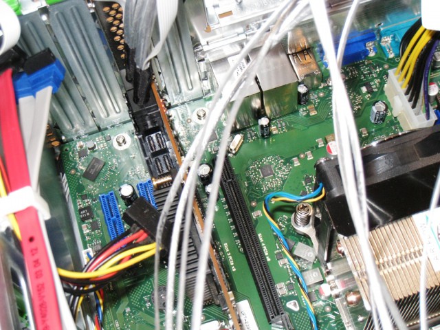 本来はPCI-E 3.0へ搭載したかったのですが、何故か認識しません。TX100S3で正式サポートしているカードでは無いのでこの辺はあきらめて一段下のPCI-E2.0のスロットに搭載。
