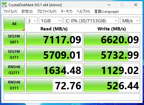 続きまして、定番のベンチマークソフト「CrystalDiskMark」を使用し、ベンチマークテストを実施いたしました。