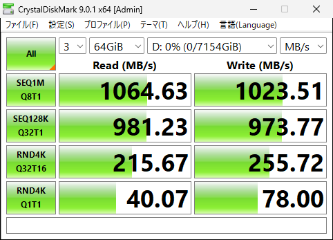 NVMe自体はPCI-E Gen5のパフォーマンスを保持しておりますが、USB変換であるMB931U-1VB R1はUSB 3.2 Gen2へ変換と