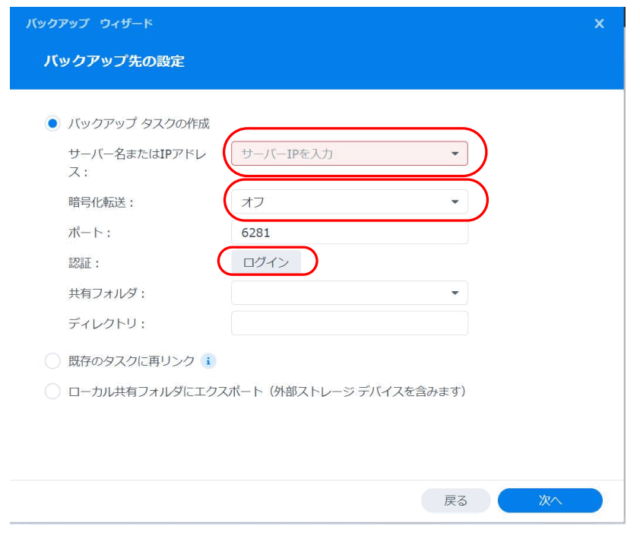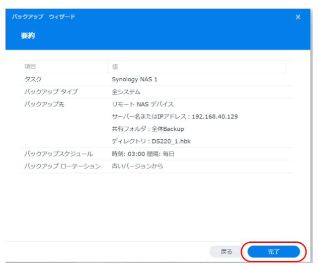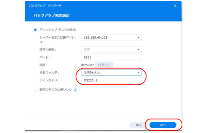 バックアップ先のSynologyNASの紐づけが完了しましたら、送り先の共有フォルダ
