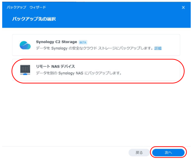 2.「リモートNASデバイス」を選択し次へをクリックします。