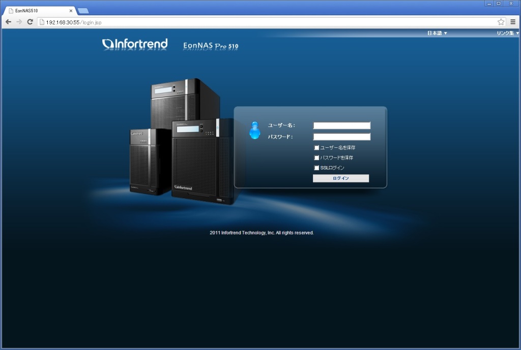 ブラウザを使って、フロントパネルから設定したIP、デフォルトIP(NIC1は10.0.0.2)、専用のスキャンソフト(Windows専用)を使って上記トップメニューを表示します。