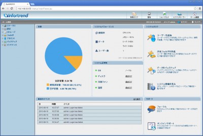 店舗デモ機は2TBx5(RAID6)構築済み。円グラフの青い部分は空き容量。オレンジが使用容量です。