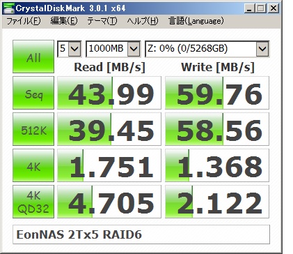 ベンチマークの結果から、Windows上でのネットワーク共有(CIFS)として使用する分では普通です。CDMは遅めですが、データを直接送った値は他社のNASと遜色ありません。