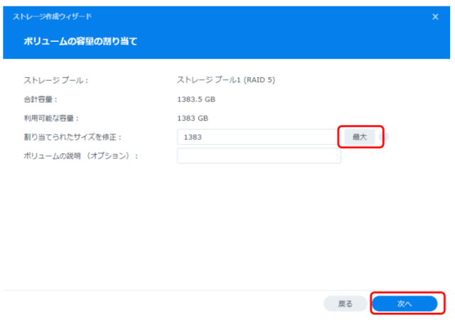 選択したディスクの総容量からボリュームを作成します。特に指定がない場合は[最大]をクリックし、