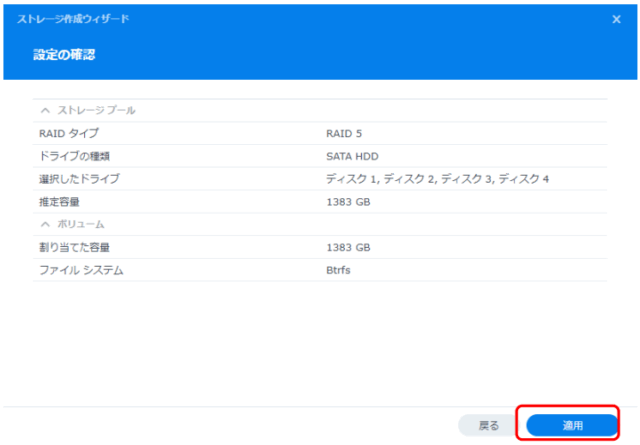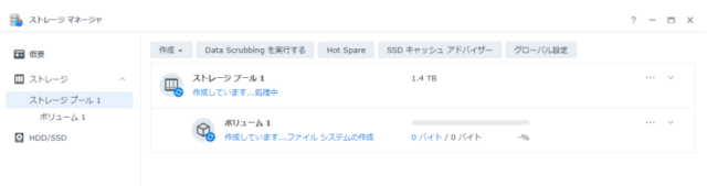 HDDの冗長化設定を行い、ボリュームを作成することによってSynologyにデータを保存することが可能になります。
