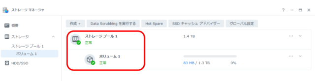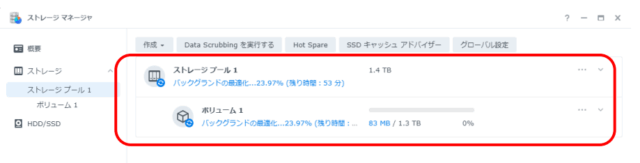 最適化が完了されると、ストレージプール、ボリュームとも正常のステータスとなり設定完了です。