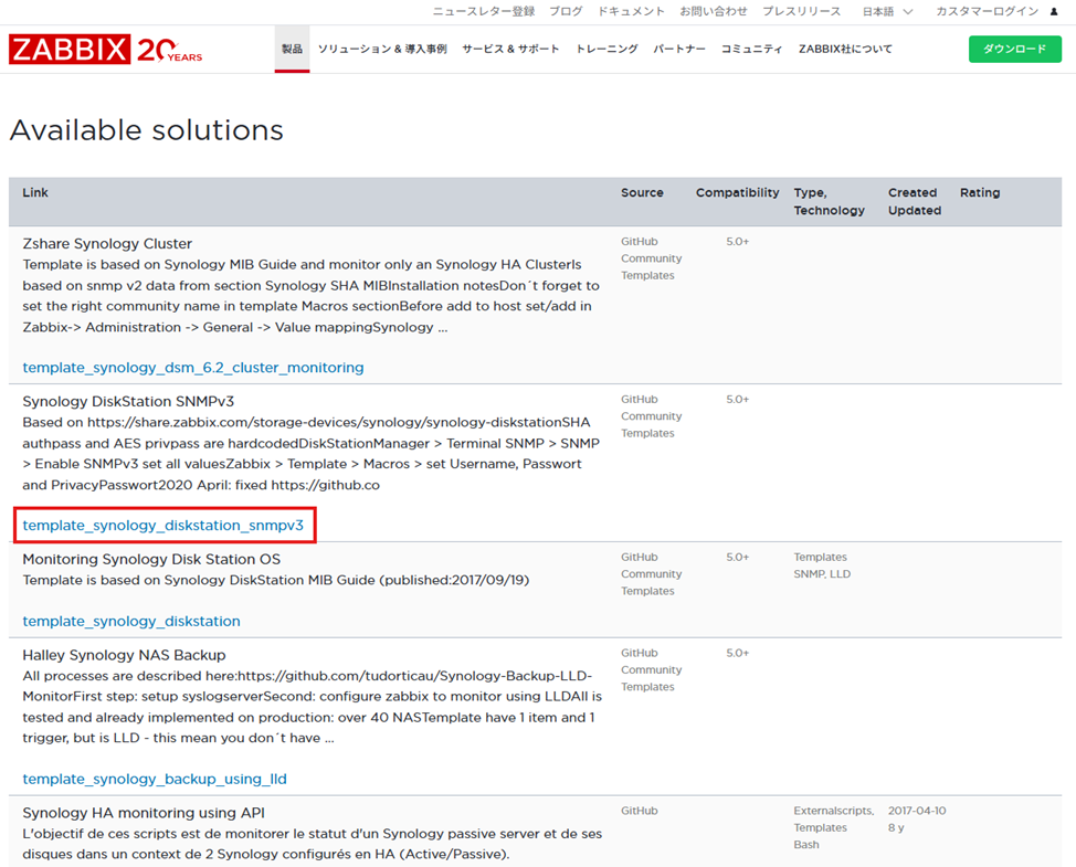続いてZabbixのSynologyテンプレートをダウンロードをしていきます。
