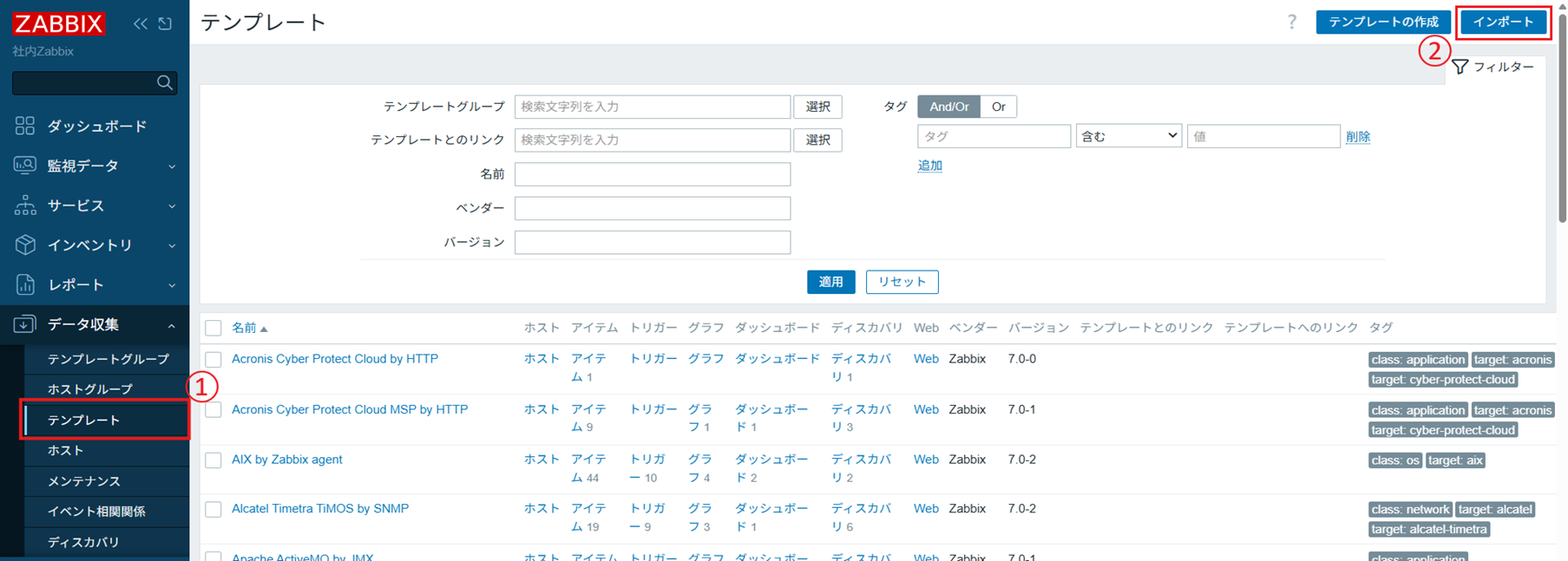 Zabbix管理画面から[データ収集] → [テンプレート] → [インポート]にて先ほどダウンロードした「.yaml」ファイルを指定します。