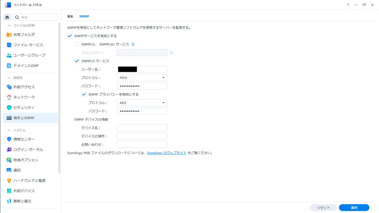 監視対象のSynologyにログインして「コントロールパネル」→「端末とSNMP」→[SNMP]タブを開き、「SNMPサービスを有効にする」と「SNMPv3サービス」にチェックを入れ、ユーザー名(Synology管理者)とパスワードを入力します。プロトコルはMD5を選択します。