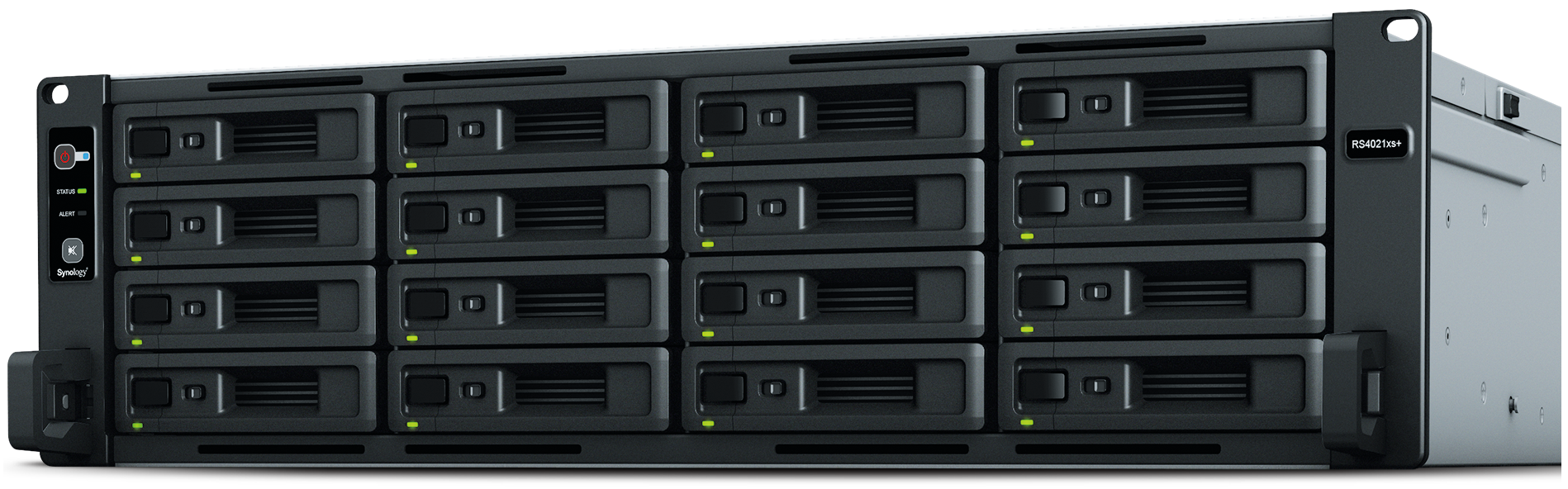 SynologyのRSシリーズは、ラックマウント型NASとして設計された企業向けラインで、サーバールームや19インチラック環境での運用を前提としたモデルです。高い拡張性、耐久性、冗長化設計に対応し、10GbEなど高速ネットワークにも最適化されています。大量データの運用、仮想化、映像制作、監視、バックアップ基盤など、ビジネスの中核ストレージとして利用できます
