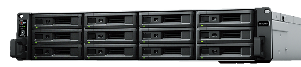 • RS3621xs+ (12ベイ): RS3621xs+は、Intel Xeon 8コアCPUとECCメモリを搭載した高性能な12ベイ・ラックマウントNASです。10GbEポートを2基標準搭載し、最大238K IOPSの高速アクセスを実現。拡張ユニットで最大36ベイまで増設可能です。二重化電源や5年保証も備え、仮想化環境や大規模ファイルサーバーなど、止まらないビジネスを支える信頼性を提供します。