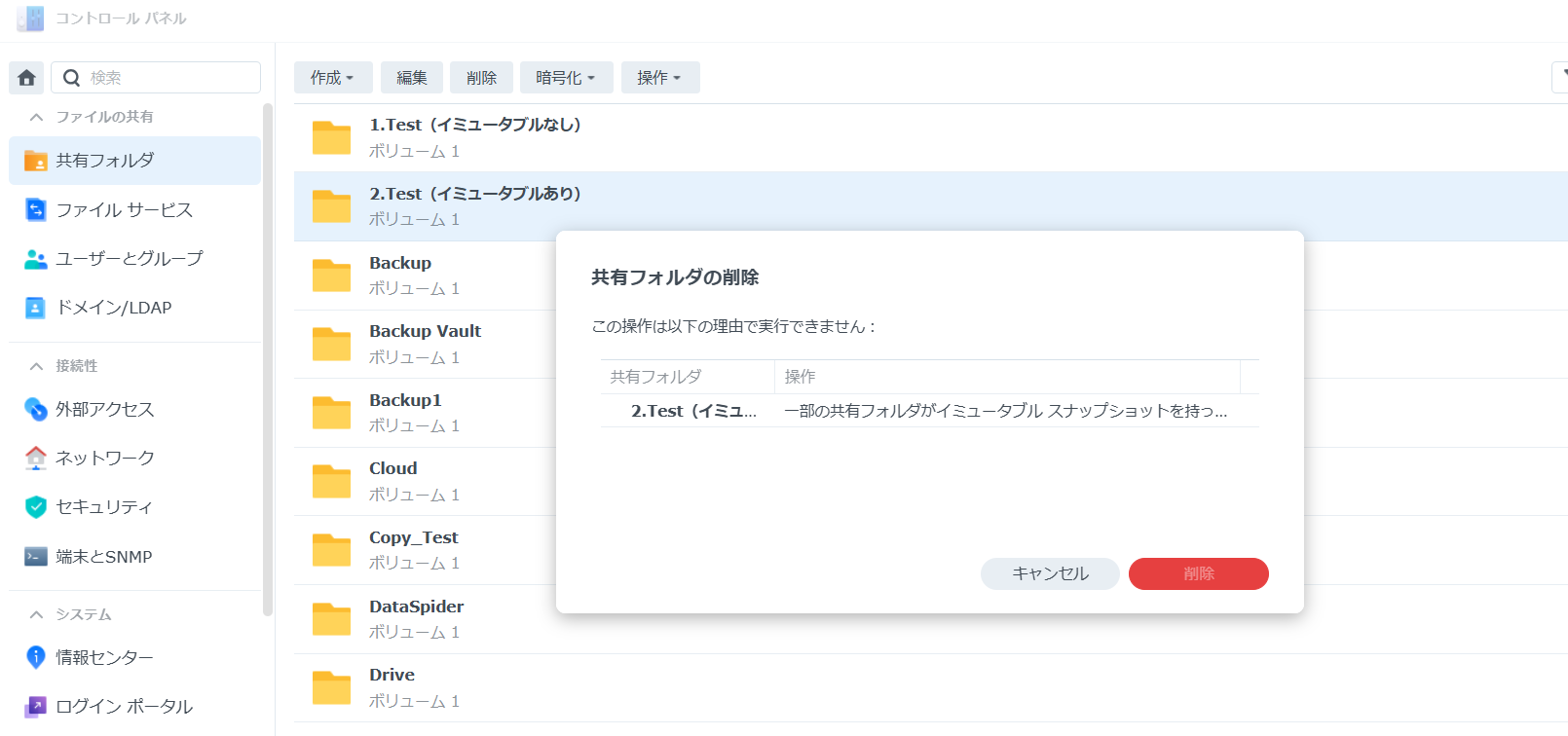 一方でイミュータブルスナップショットの場合、管理者権限でアクセスしたとしても「削除」がグレーアウトされておりスナップショットを消すことができません。