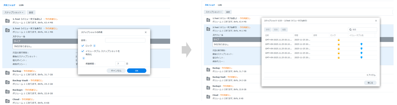 イミュータブルスナップショットとは、指定期間中は削除・改ざんが一切できない“変更不可能なスナップショット” のことです。