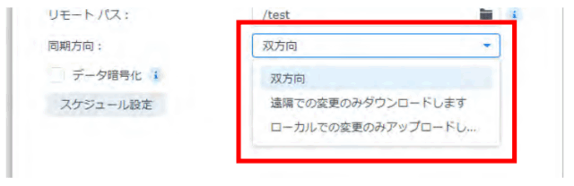 また、同期の方向は、Synology NASからアップロードのみ、クラウドサービスからの