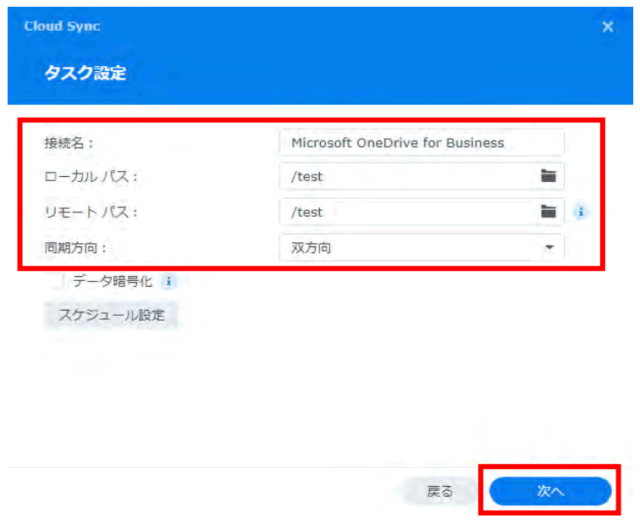 ・設定を「クラウドからNASへの一方向ダウンロード」にする。
