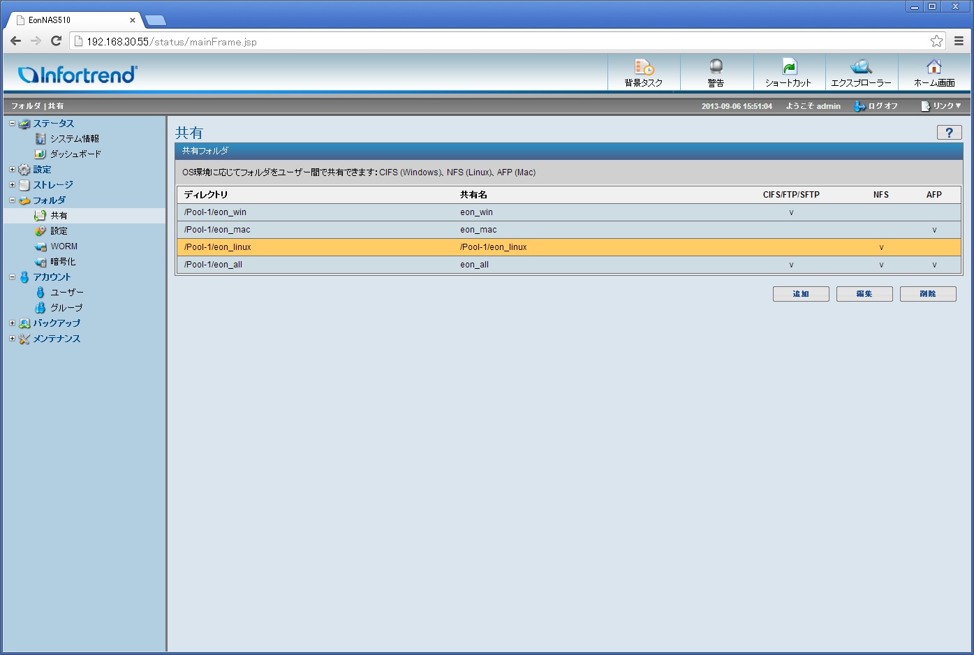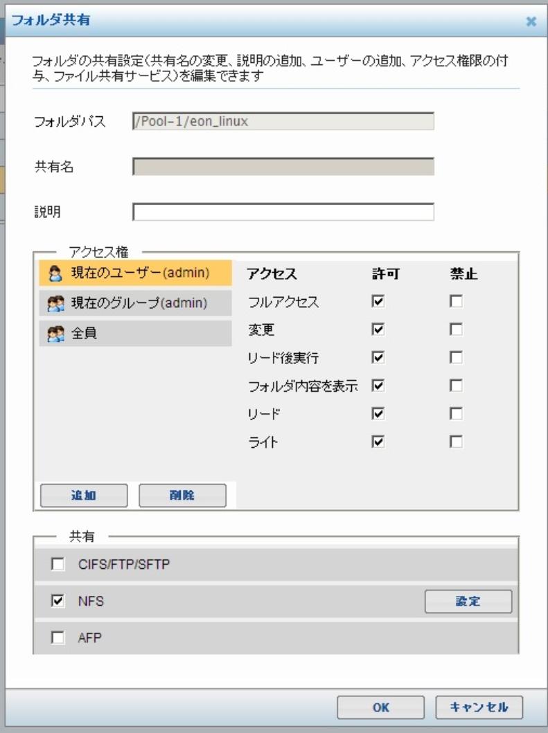 まずは共有領域を作成します。今回はeon_linuxという共有領域を作成しました。