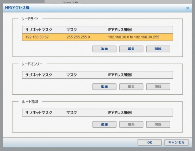 権限情報を登録します。弊社のLinux機は192.168.30.52です。EonNAS側の設定は以上です。