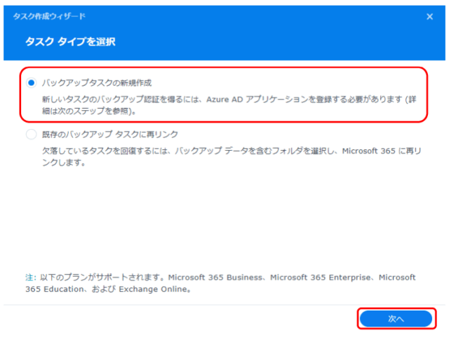 「バックアップタスクの新規作成」にチェックが入っていることを確認し「次へ」をクリックします。