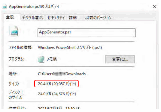 続いて、ダウンロードしたファイル AppGenerator.ps1 右クリックして「プロパティ」を開きます。