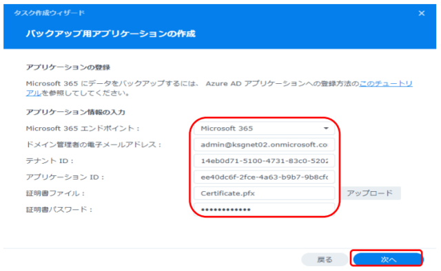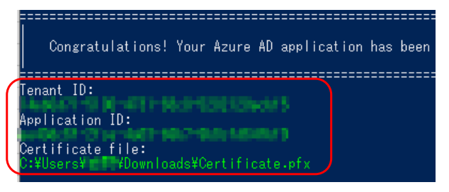 グローバル管理者のメールアドレスや、テナントID、アプリケーションID、証明書ファイル、