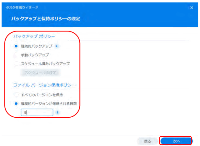 バックアップポリシーとバージョンポリシーを指定し、「次へ」をクリックします。