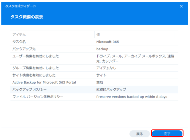 各設定を確認し、「完了」をクリックします。これで設定は完了です。