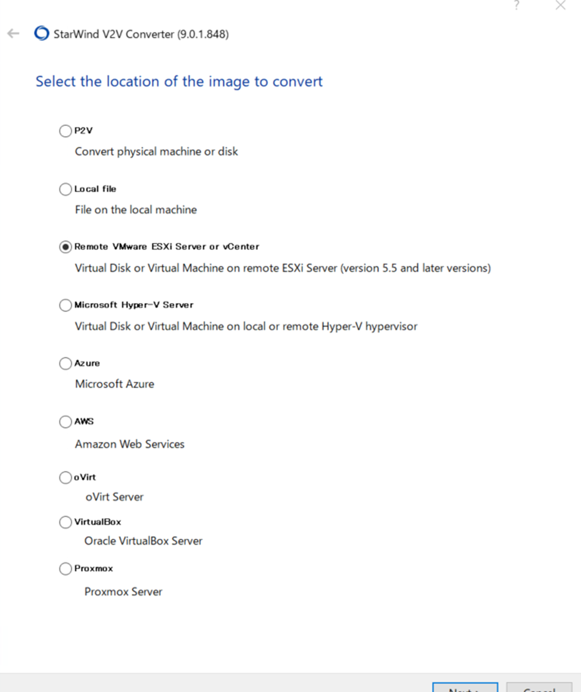 ・インストール後、starwind v2v converterを起動して、「Remote Vmware ESXi Server or vCenter」にチェックを入れて「Next」をクリックします。