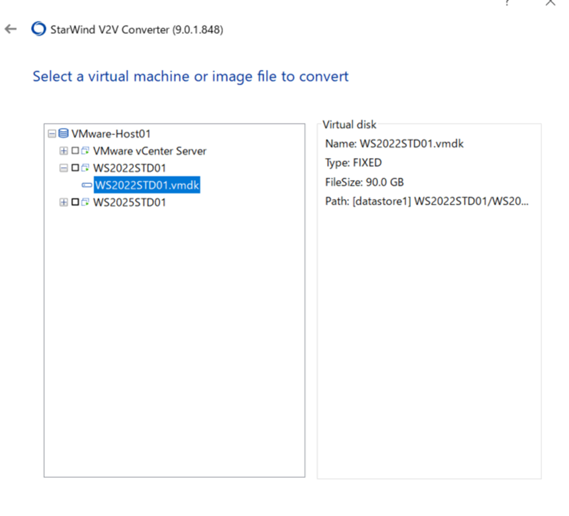 仮想ディスク単体の変換だけでなく、ESXi上の仮想マシンを直接指定してHyper-Vへ変換・転送することも可能です。