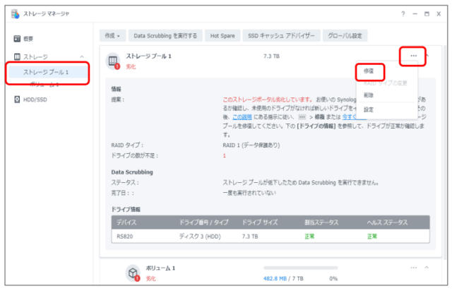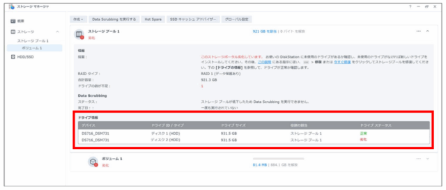 ディスクの状態については、[ストレージプール]>[ボリューム1]からも確認が可能です。