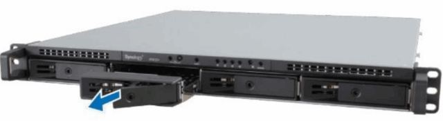 RS818+/RS818RP+、RS820+/RS820RP+の場合は、ドライブキャリアの取っ手を手前に引き出してHDDを取り出します。