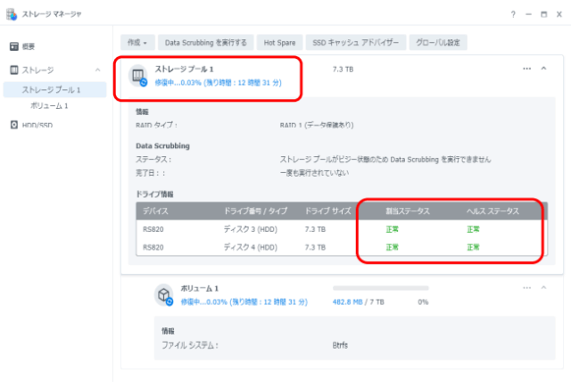 修復中となり、割り当てステータス、ヘルスステータスともに[正常]になっていることを確認し、HDD交換作業完了です。