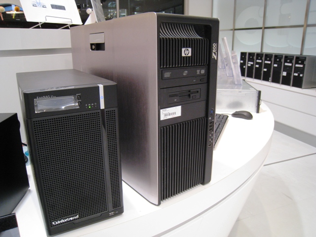 Z800を使用して作成したデータを共有ストレージに保管する際、一般的なNASを使用しますが、エクセルやpdfのように数MBであれば気になりませんが、巨大な動画データであれば数GBありますので、データの転送に時間がかかります。そこで今回は転送時間を短縮するため10GbEのカードをz800に搭載し、ストレージ側も10GbEを搭載したInfortrend EonNAS850-2を採用してネットワーク直結を行ってみました。世の中で広く使われている1GbEの転送速度と超高速10GbEでの速度差を検証してみます。