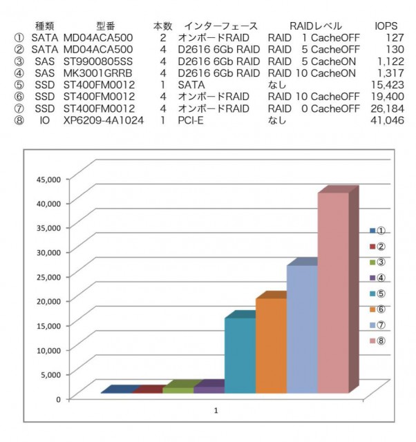 SSDは弊社推奨のIntel s3500 240GB でも約3万円です。IOカードに比べて値は落ちますが、それでもSATA、SASを大きく引き離しています。現状では、コスト面とパフォーマンスからSSDの導入が一番かもしれません。