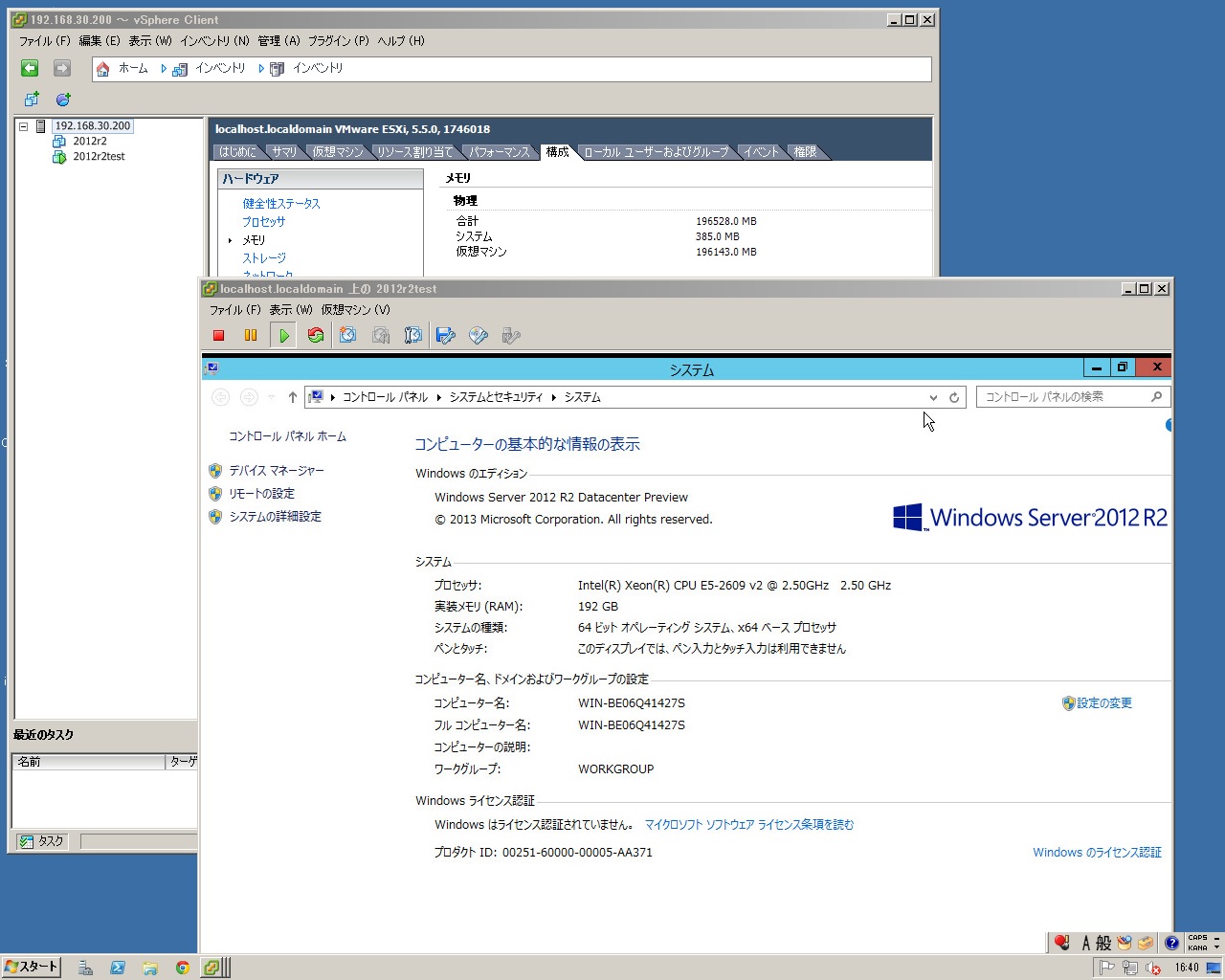 Primergy RX200S8に16GBのメモリを12枚搭載して192GBの認識。その状態でESXi5.5のインストール。VMclientでハイパーバイザーのキーを入れたところエラーも無く更新できました。念のため仮想OSをインストール。2012R2データセンターを192GBで起動できるか確認。こちらも問題なし。