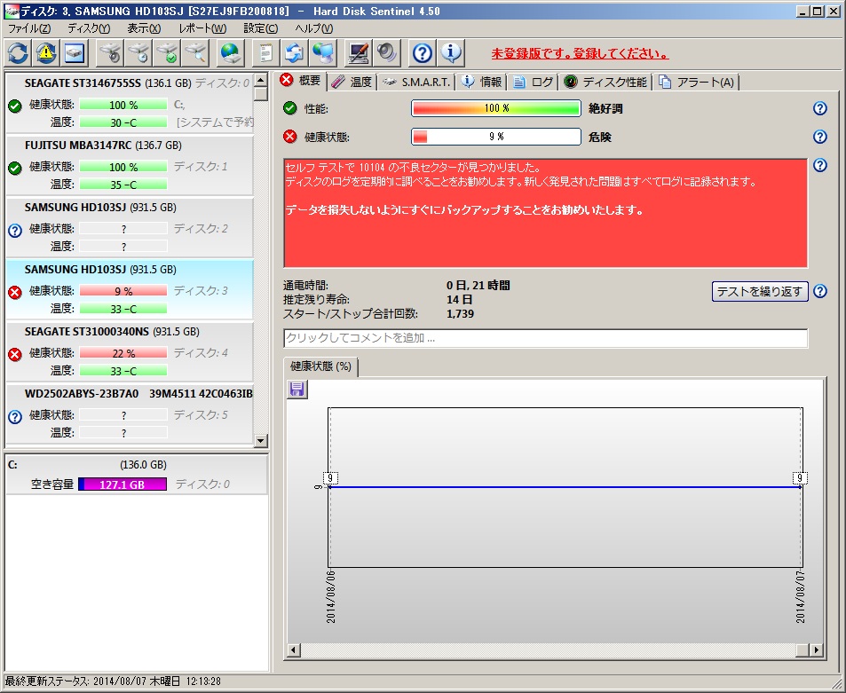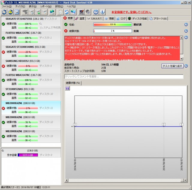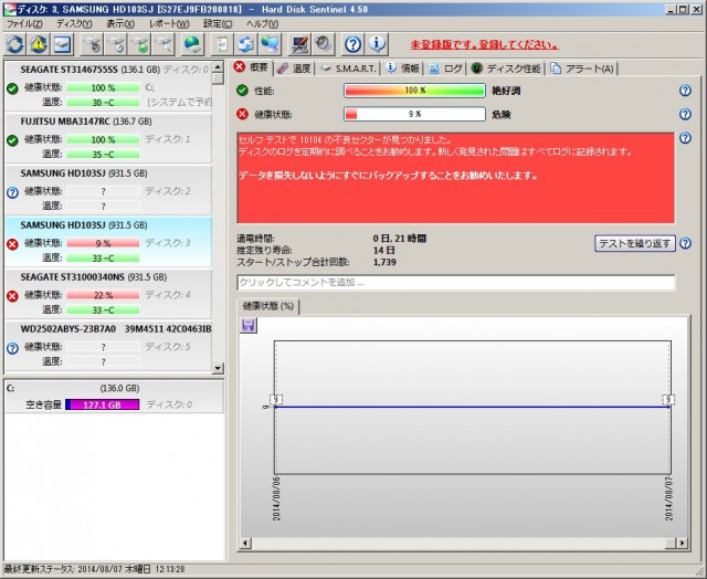 このようにバッドセクタを大量に持っているにもかかわらず、OS上で認識しています。
