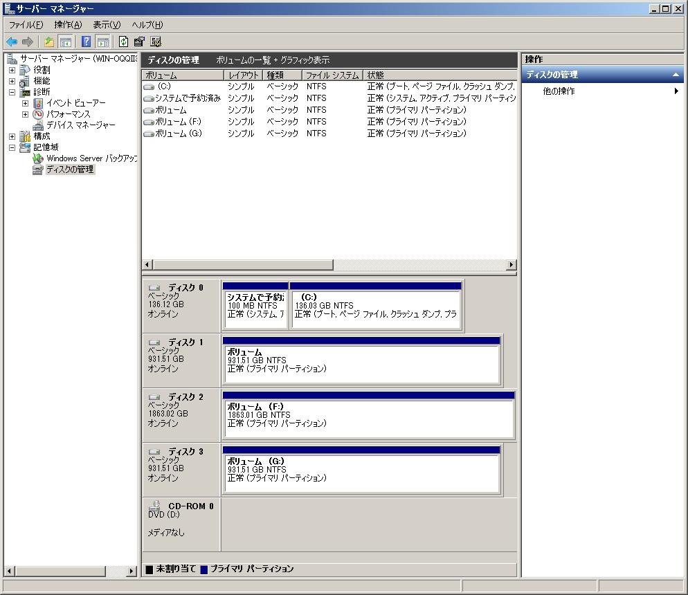 故障したHDDであればWindows上でマウントされませんし、Droboであれば赤ランプが点灯します。今回、このような状態のHDDでもWindowsServer上で認識出来ました。Drobo上でも認識出来ています。データの読み書きもできました。
