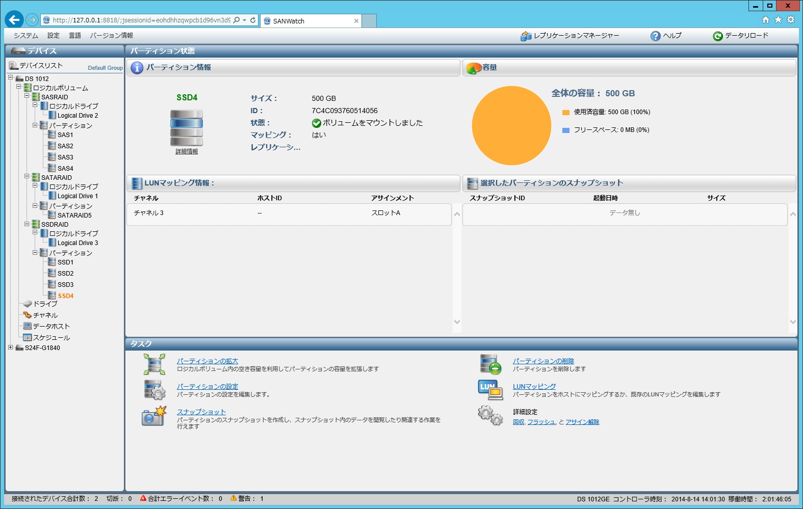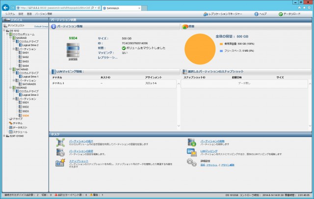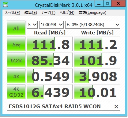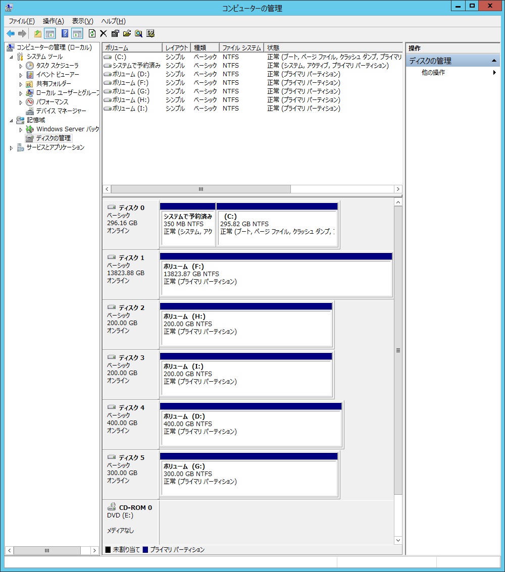 このようになっています。SATAとSASはRAID5、SSDはRAID0を構成しました。