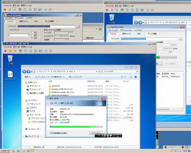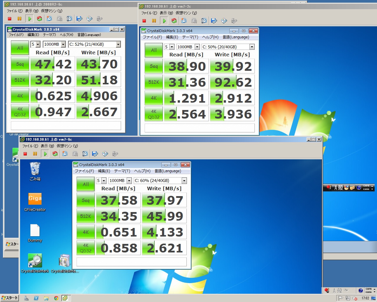 仮想OSにクリスタルディスクマークをインストールし、3台同時に実行してみました。