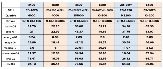 この値を見る限りではQuadro4000は既に過去のカードとなってしまいました。現行のカードなので当たり前かもしれませんがK4200の値が飛び抜けております。K5000より高速です。ワークステーションのCPU性能は考慮されていないようです。スペック的には一番劣るZ210SFFにK1200を組み込んだ場合の結果と、Z820でQuadro4000を組み込んだ場合の結果ではZ210SFFの方が上でした。この結果からワークステーションはCPUだけを高速化するのではなく、メモリ、内蔵ディスク、グラフィックカードをコストを踏まえてバランス良く構成することが必要となります。