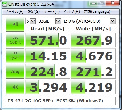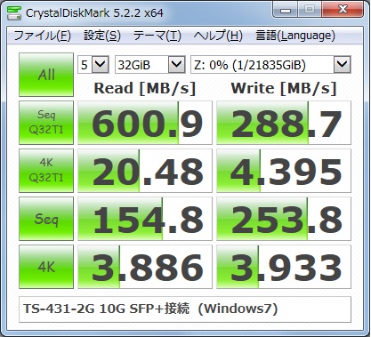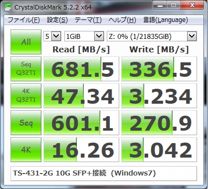 結構良い速度が出ました。USB3.0や1GイーサのNASを大きく上回っています。これなら巨大なデータを転送してもストレスがありません。