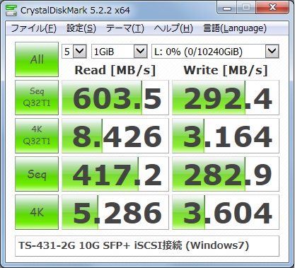 以前はCIFSよりiSCSIの方が速度面では大きく上回っていました。今回はどうでしょうか。まずは同じく1GBで計測。