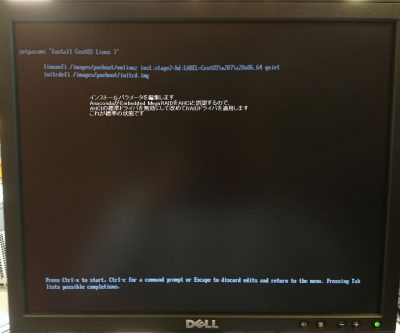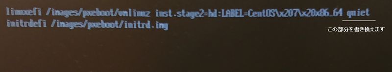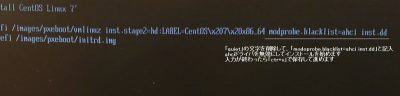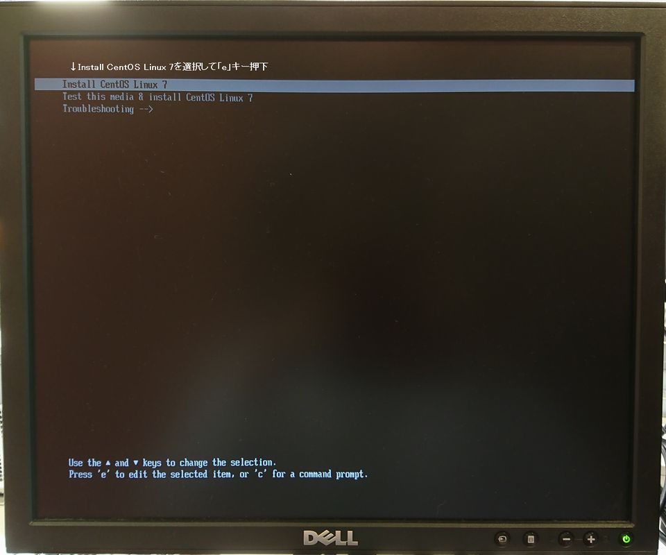 「Install CentOS Linux 7」にカーソルを合わせてから、「e」キー(編集)を押下します